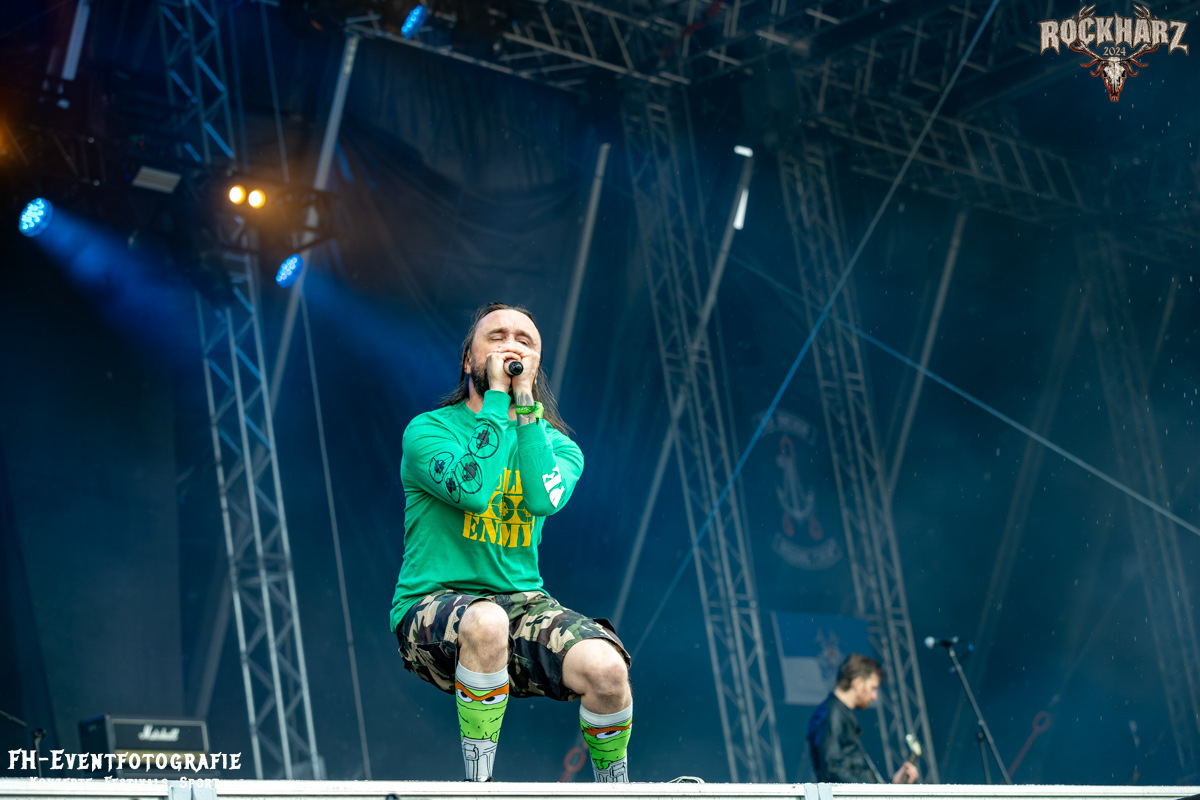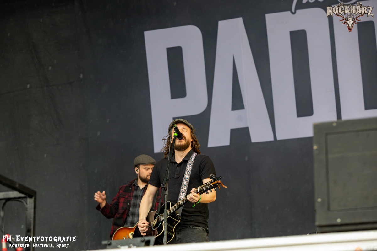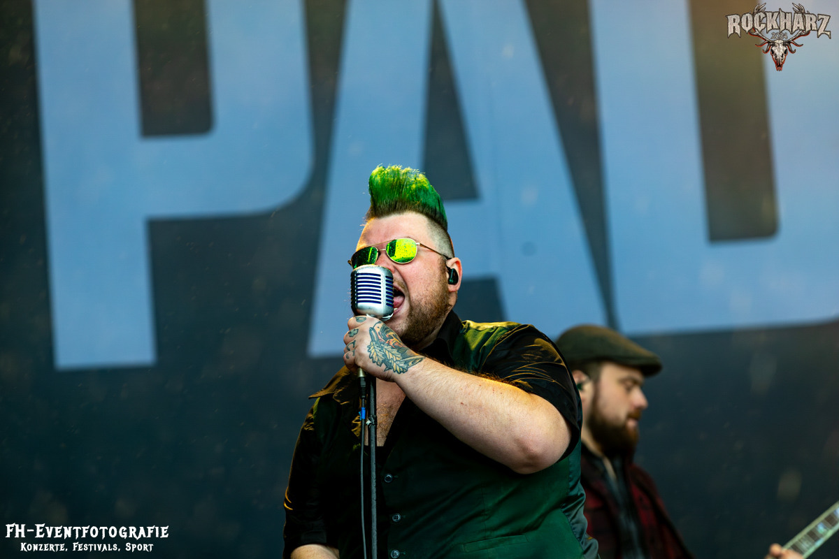 Nach diesem Exkurs in die Neue Deutsche Härte wurde im Anschluss neben sehr dunklen Wolken auch Irish Party Folk gegeben. Die The O’Reillys and the Paddyhats hatten wie immer eine Menge Spaß auf der Bühne. Diese enorm ansteckende Freude übertrug sich praktisch instant auf die Fans vor der Bühne. Leider hatte Petrus als Partybeitrag einen heftigen Platzregen im Gepäck. Nachdem wir die teure Kameratechnik verstaut hatten, konnte ich es mir nicht nehmen lassen, doch noch mal nach vorn zu gehen. Und krass, ich hatte einen Hut im Vorfeld mitgenommen. Die Fans waren augenscheinlich besser vorbereitet. Einige hatten glatt die obligatorischen Einwegponchos dabei und bestimmt 4000 Menschen (so schätze ich) hatten einfach beschlossen, den Regen zu ignorieren und die O´Reilleys zu feiern. Hy, Fans sind halt Fans und Spaß ist halt auch durch Regen nicht zu stoppen. Dieser Platzregen wurde dann doch zu einem etwas längerem Vergnügen. Keine Unmengen an Regen, aber durchaus ergiebig hielt sich dann die erhöhte Luftfeuchtigkeit.