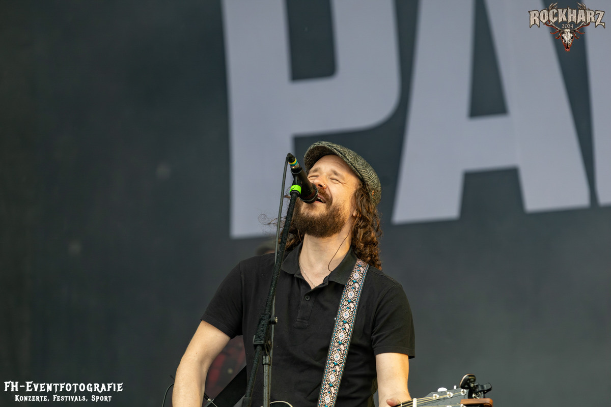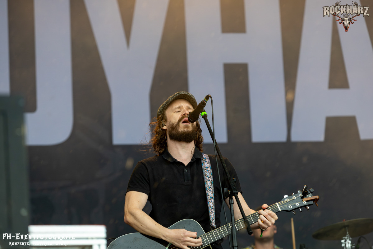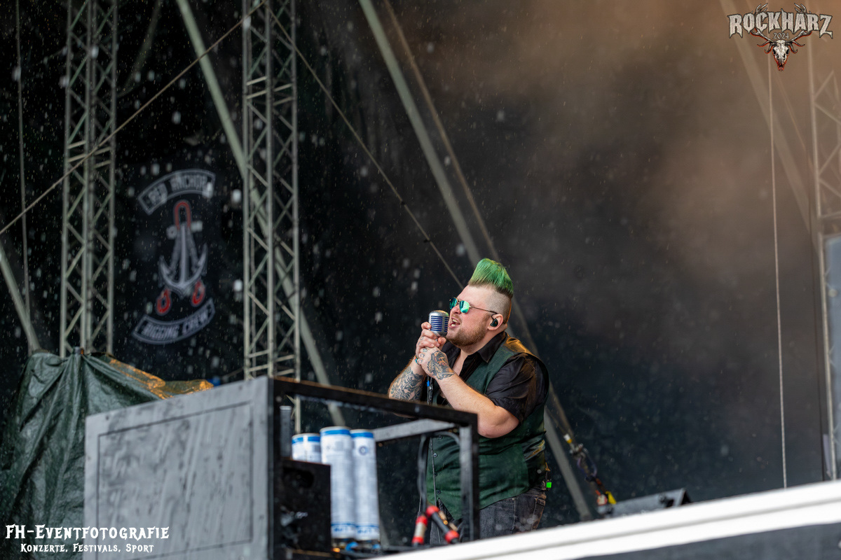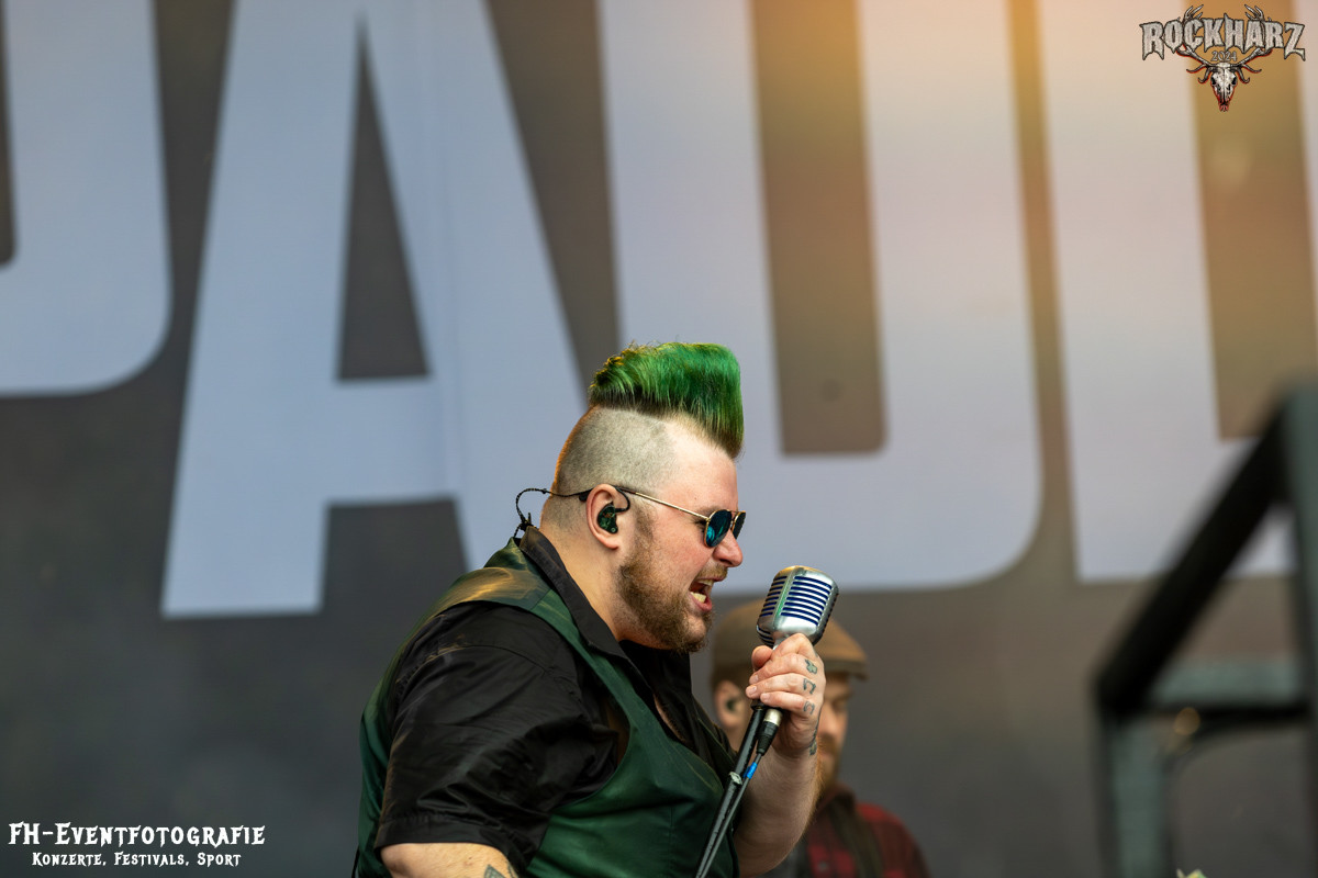 Nach diesem Exkurs in die Neue Deutsche Härte wurde im Anschluss neben sehr dunklen Wolken auch Irish Party Folk gegeben. Die The O’Reillys and the Paddyhats hatten wie immer eine Menge Spaß auf der Bühne. Diese enorm ansteckende Freude übertrug sich praktisch instant auf die Fans vor der Bühne. Leider hatte Petrus als Partybeitrag einen heftigen Platzregen im Gepäck. Nachdem wir die teure Kameratechnik verstaut hatten, konnte ich es mir nicht nehmen lassen, doch noch mal nach vorn zu gehen. Und krass, ich hatte einen Hut im Vorfeld mitgenommen. Die Fans waren augenscheinlich besser vorbereitet. Einige hatten glatt die obligatorischen Einwegponchos dabei und bestimmt 4000 Menschen (so schätze ich) hatten einfach beschlossen, den Regen zu ignorieren und die O´Reilleys zu feiern. Hy, Fans sind halt Fans und Spaß ist halt auch durch Regen nicht zu stoppen. Dieser Platzregen wurde dann doch zu einem etwas längerem Vergnügen. Keine Unmengen an Regen, aber durchaus ergiebig hielt sich dann die erhöhte Luftfeuchtigkeit.