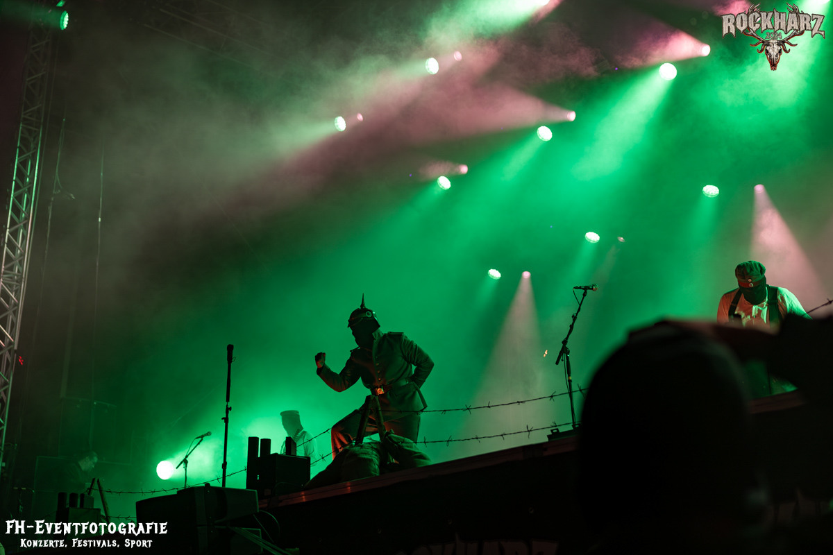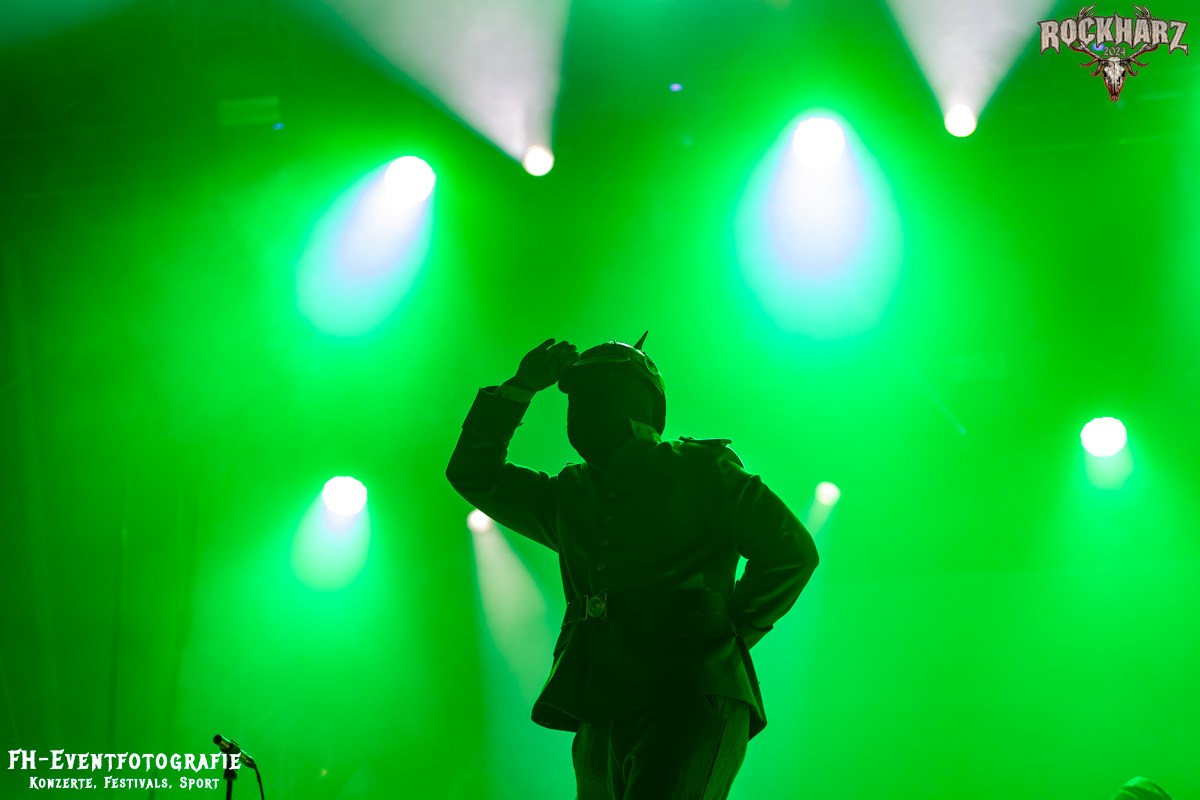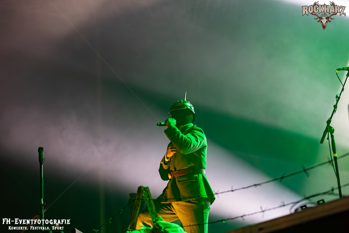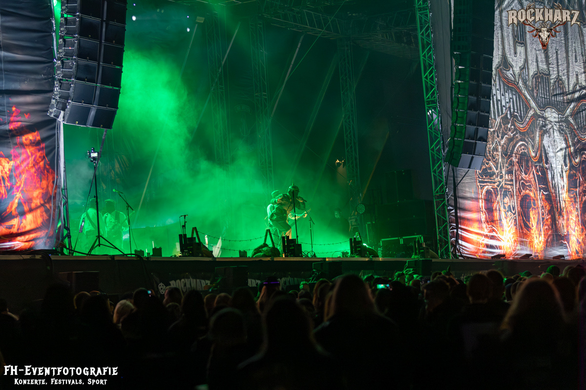 Im Anschluss übernahmen Kärbholz die Bühne. Das Rockharz ist aus seinen Ursprüngen ja „Rock gegen Rechts“. Somit ist bis heute gesichert, dass das Festival ohne seltsames Gedankengut auskommt. Aus dieser Tradition heraus ist also klipp und klar, dass weder die Band Kärbholz noch die Afterheadliner Kanonenfieber in dieses Gedankengut reinreichen. Die Kärbholzer machen einfach Spaß und die Kanonenfieberer sind schon fast Kunst. Dank der richtig fetten Show mit viel Pyro, Flammen und Nebel gab der Bamberger Musiker mit seinen Guns einen Auftritt, der insgesamt ein Gesamtkunstwerk war, welcher den ersten Tag des Rockharz würdig abgeschlossen hatte. Aber bevor es zu Kanonenfiebers Auftritt kam, gab es noch vier Bands. Zwei davon waren schon in meinen Playlisten zu Zeiten, in denen es in Braunschweig noch die Meier Music Hall gab. Da wären Callejon und OOMPH!. Callejon hatten sich ja leider, muss ich nach deren Auftritt sagen, aus meinem Gedächtnis wirklich etwas geschummelt. Aber völlig zu Unrecht. So wie es ausschaut, sind die Bands, die sich selber, mit einem ausgelassenen, gar überbordenden Frohsinn auf der Bühne zeigen, auf dem Vormarsch. Ich habe Callejon wieder in meine Playlist aufgenommen. OOMPH! waren mit dem nun voll etablierten Herrn Schulz als Frontmann auf der Bühne. Ich hatte mir da die Zeit genommen, Bilder zu sortieren und etwas zu essen. Dabei hatte ich natürlich dem Konzert gelauscht. Es ist schon echt beeindruckend, wie nahe und gut Herr Schulz an Deros Gesangsstimme herankommt. Aber wenn er spricht, ist er halt der Schulz. Immer wieder ungewöhnlich, aber die Musik ist und bleibt einfach Teil meiner Jugend und sicher auch vieler anderer. Fehlen noch drei Auftritte. Da werde ich mich kurzfassen.