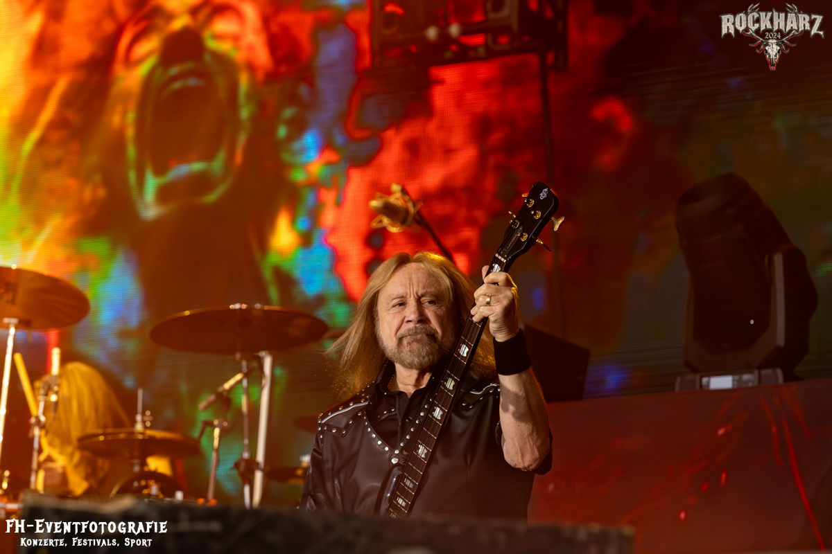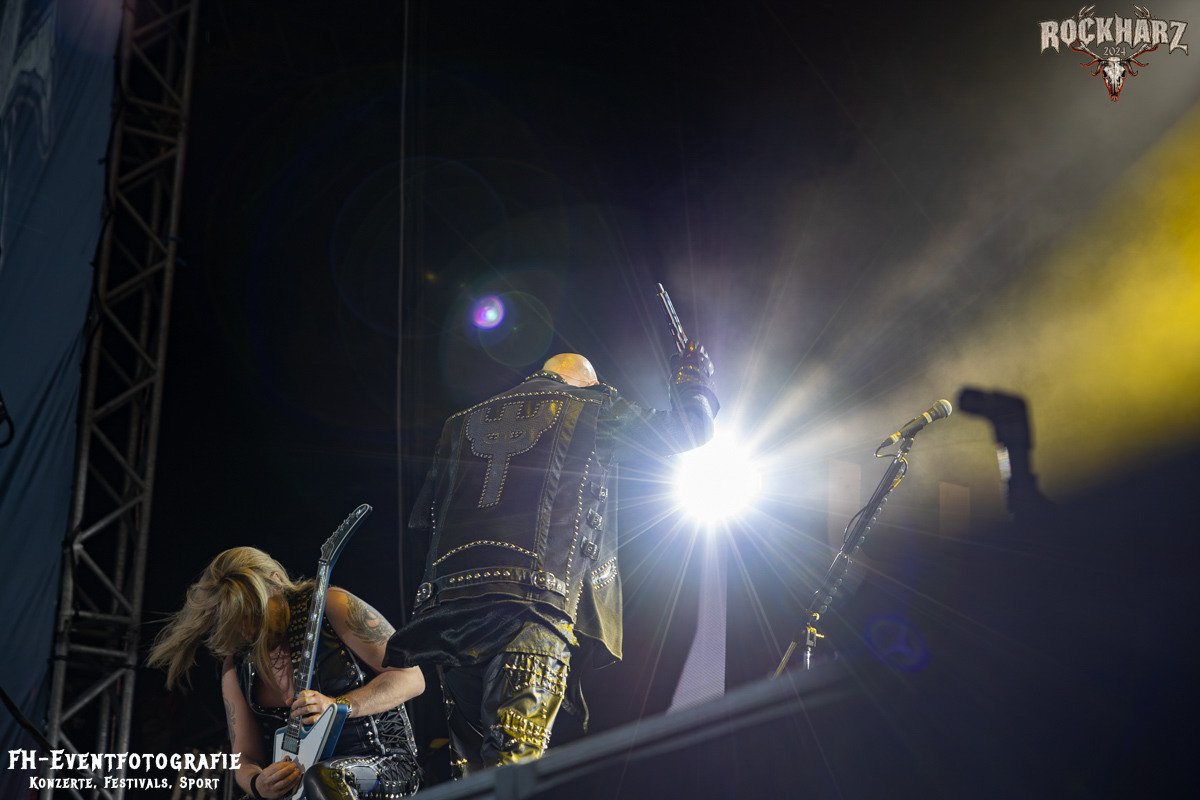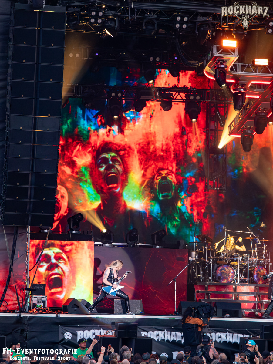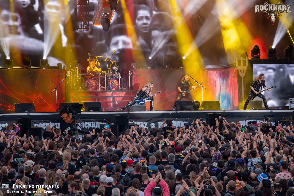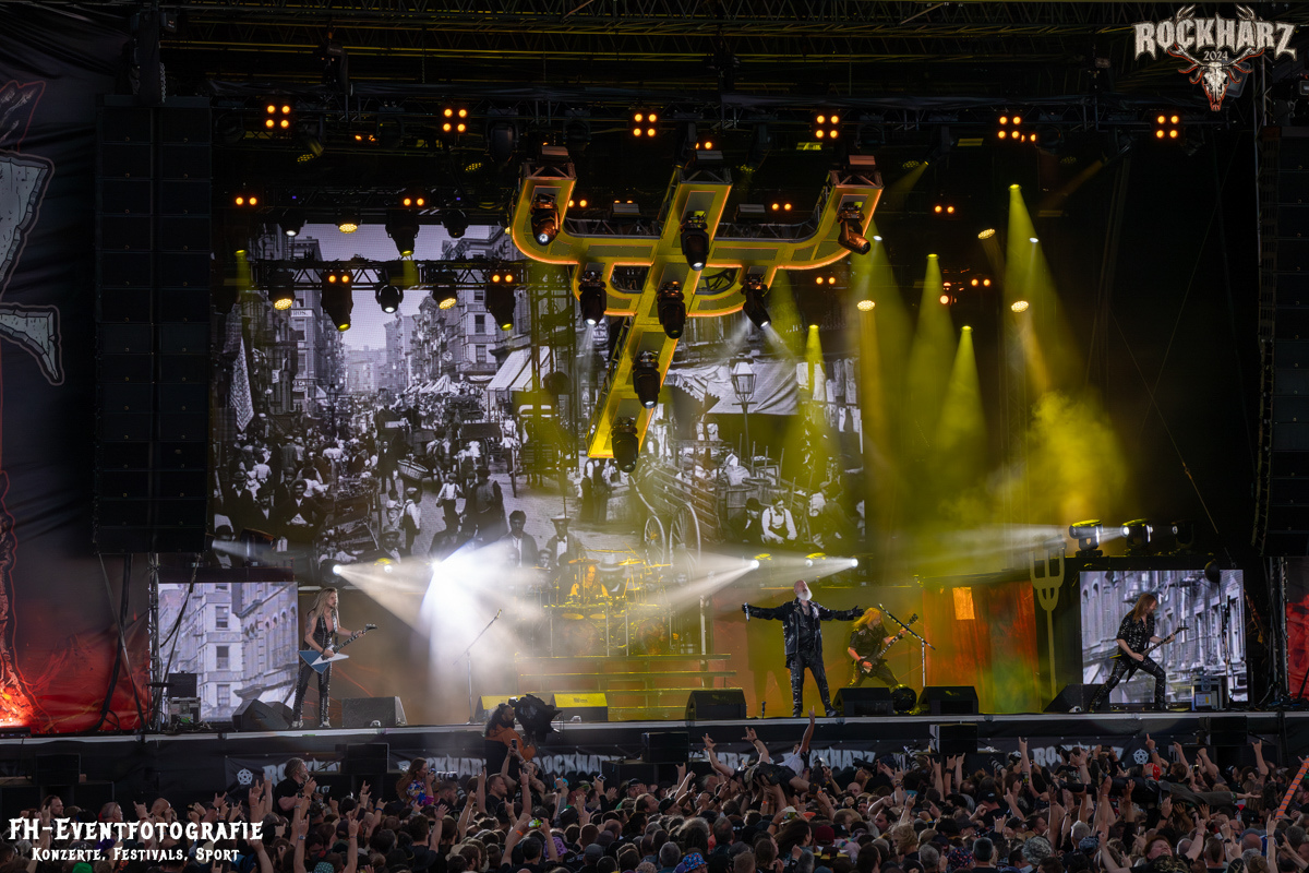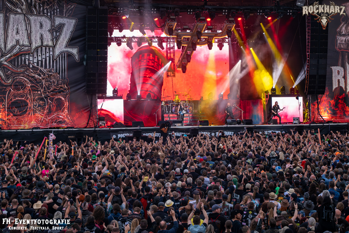 Die Umbauphase, also besser die Zeit zum Luftholen nach den Godfathers of British Heavy Metal nutzte die Rockharz Crew. 25.000 Menschen können auch einfach schweigen und so ihren Respekt und Dank ausdrücken. Danke an die großartigen Fans des Rockharz Open Air. Eskaliertes Danke rufen, das dabei in tosendem Beifall untergeht, war da sicher ein tolles Dankeschön der Fans an die Machermeute. Wo soll das Festival nur noch hinführen? Wir werden es 2025 definitiv erleben und die Jahre danach auch.
