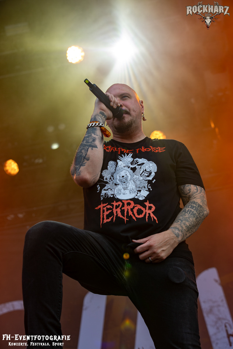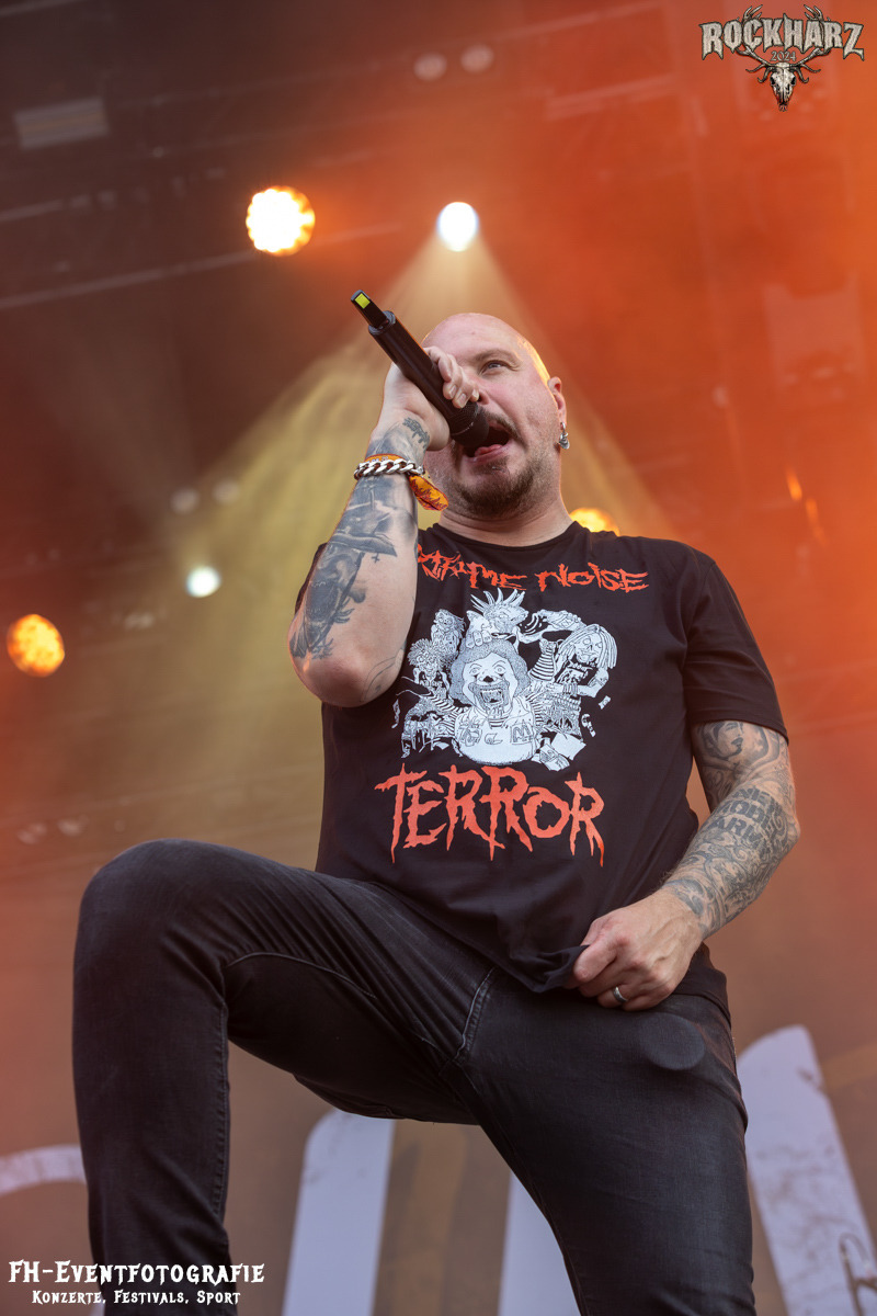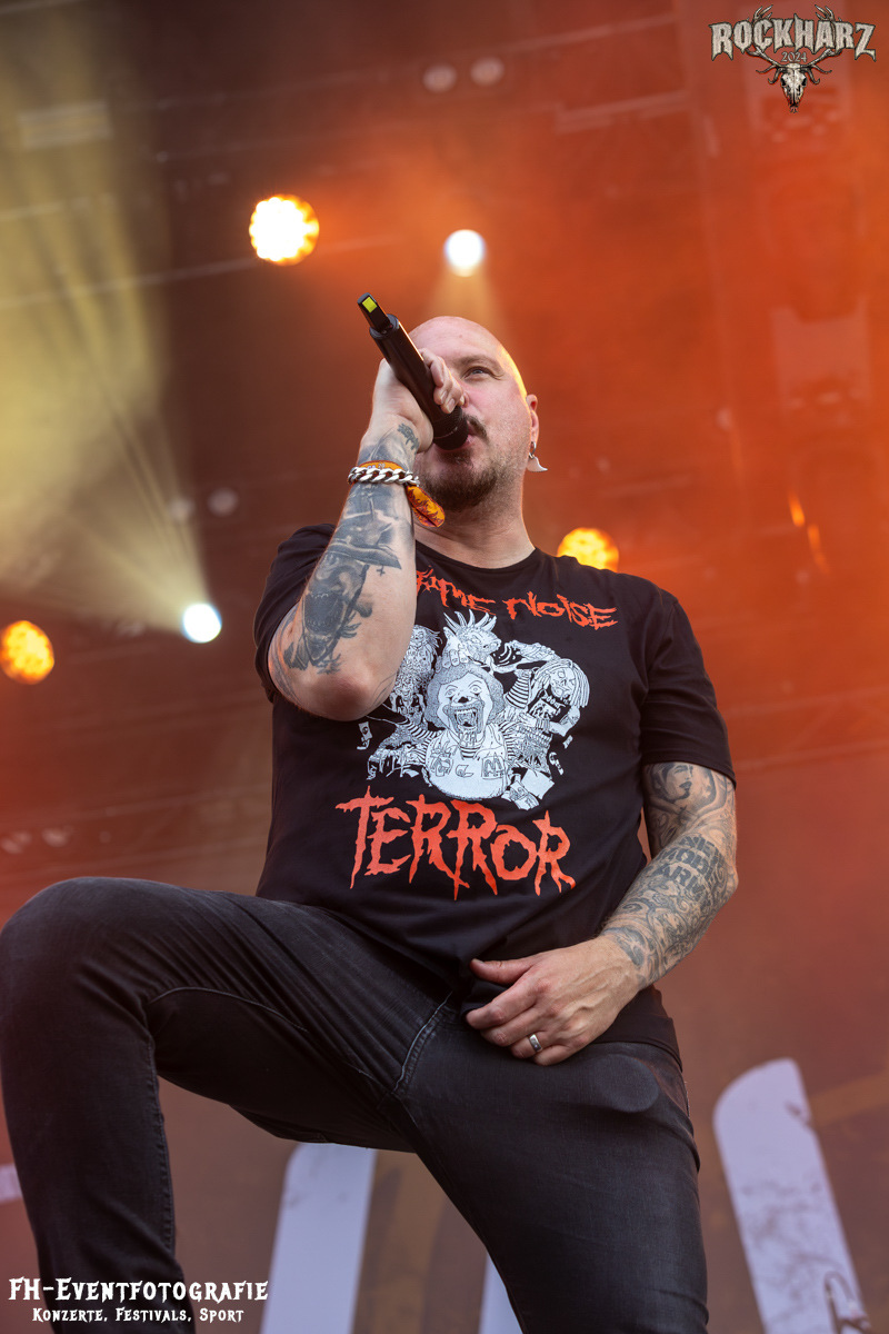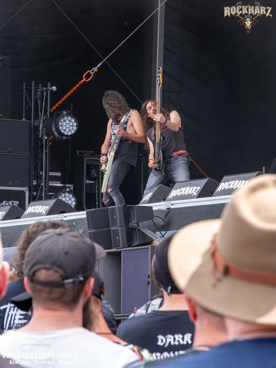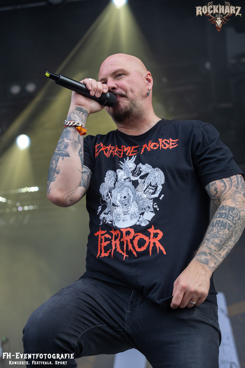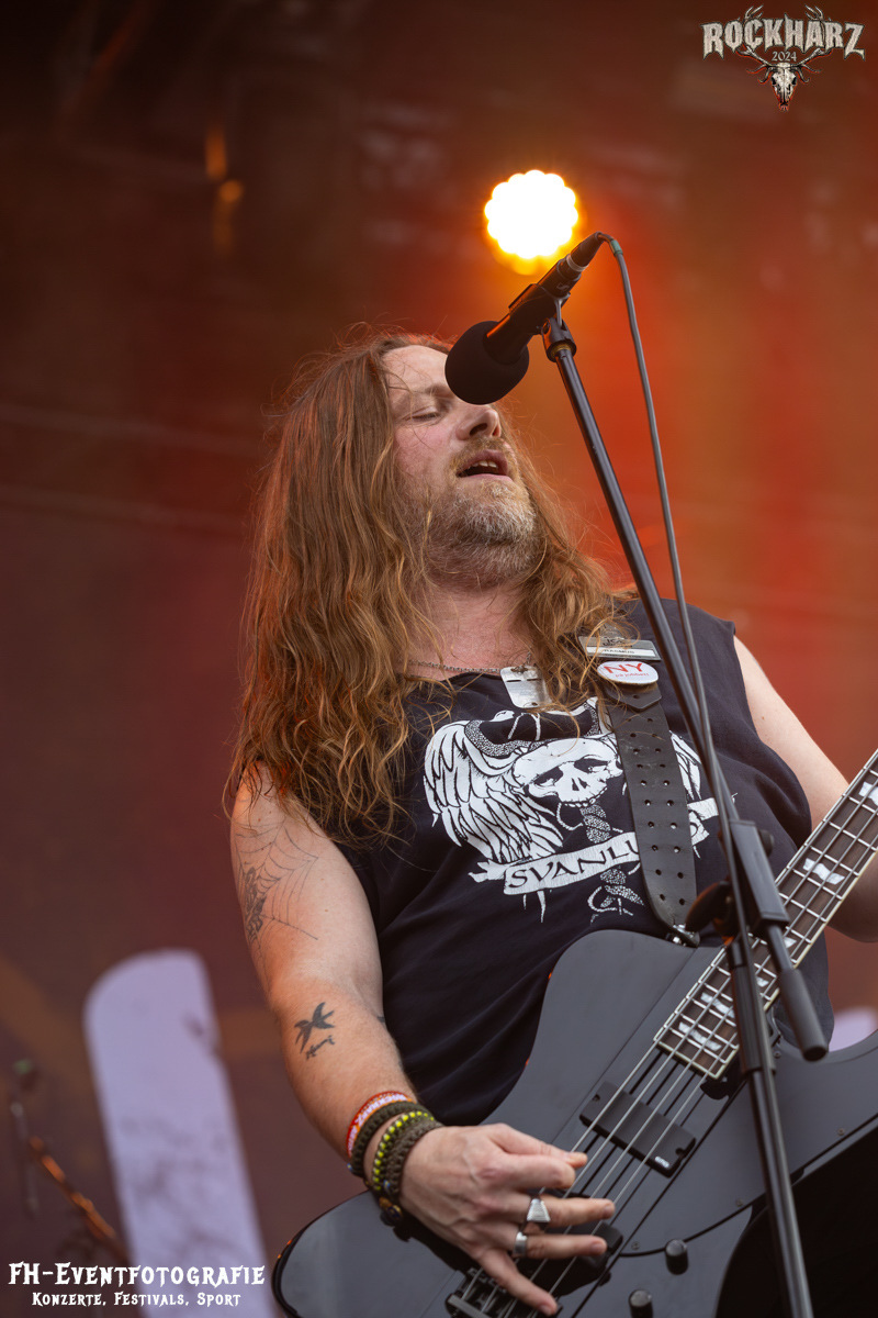 Starten wir. Den Weckdienst machten am Samstag Nakkeknaekker. Die Dänen haben schon einiges durch, trotz der vergleichsweise kurzen Bestandszeit dieser Combo. Gegründet 2020 und dann ab durch die Chaoszeit für alle Kulturschaffenden. Die Jungs aus der Mitte Dänemarks hatten augenscheinlich das Beste daraus gemacht. 2024 nun auch einen Stopp auf dem Rockharz eingelegt und das Festivalgelände aus dem Bier- und Kältekoma gerissen. Mich haben sie auch wach bekommen. Fabian war bereits pünktlich auf dem Infield und hat euch die Band in Bunt abgelichtet. Ich habe bei Rührei und Kaffee den dänischen Deathmetal zum Tagesstart genossen.