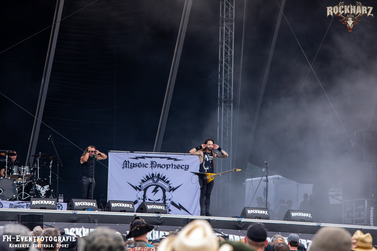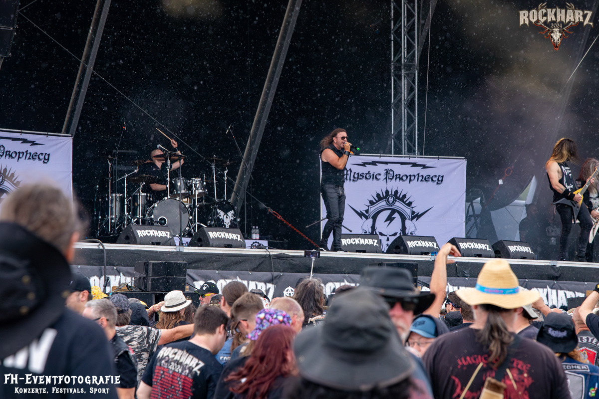 Nach diesem Ausflug in musikalische Randgebiete ging es zur Kernkompetenz des Festivals zurück. Metal, Power-Metal. Das Ganze dargeboten von einer liebgewonnenen Band, die ich auch auf dem Metal Frenzy 2024 erleben durfte. Mystic Prophecy spielten den letzten Gig des Samstags für viele Stunden. Während wir das Konzert in vollen Zügen genossen, zogen am Horizont einige sehr düstere Wolken auf. Mein Bauchgefühl meldete sich da auch schon beim Blick in den Himmel. Aber hey, Regen gehört zu einem Festival. Also meldete ich mich bei Fabian mal ab und schlenderte zum Camp zurück, um mich mit einem passenden Hut auszustatten. Kurz vor dem Camp klingelte mein Handy und die Nachricht: Mach langsam und bleib im Camp, das Infield wird geräumt.