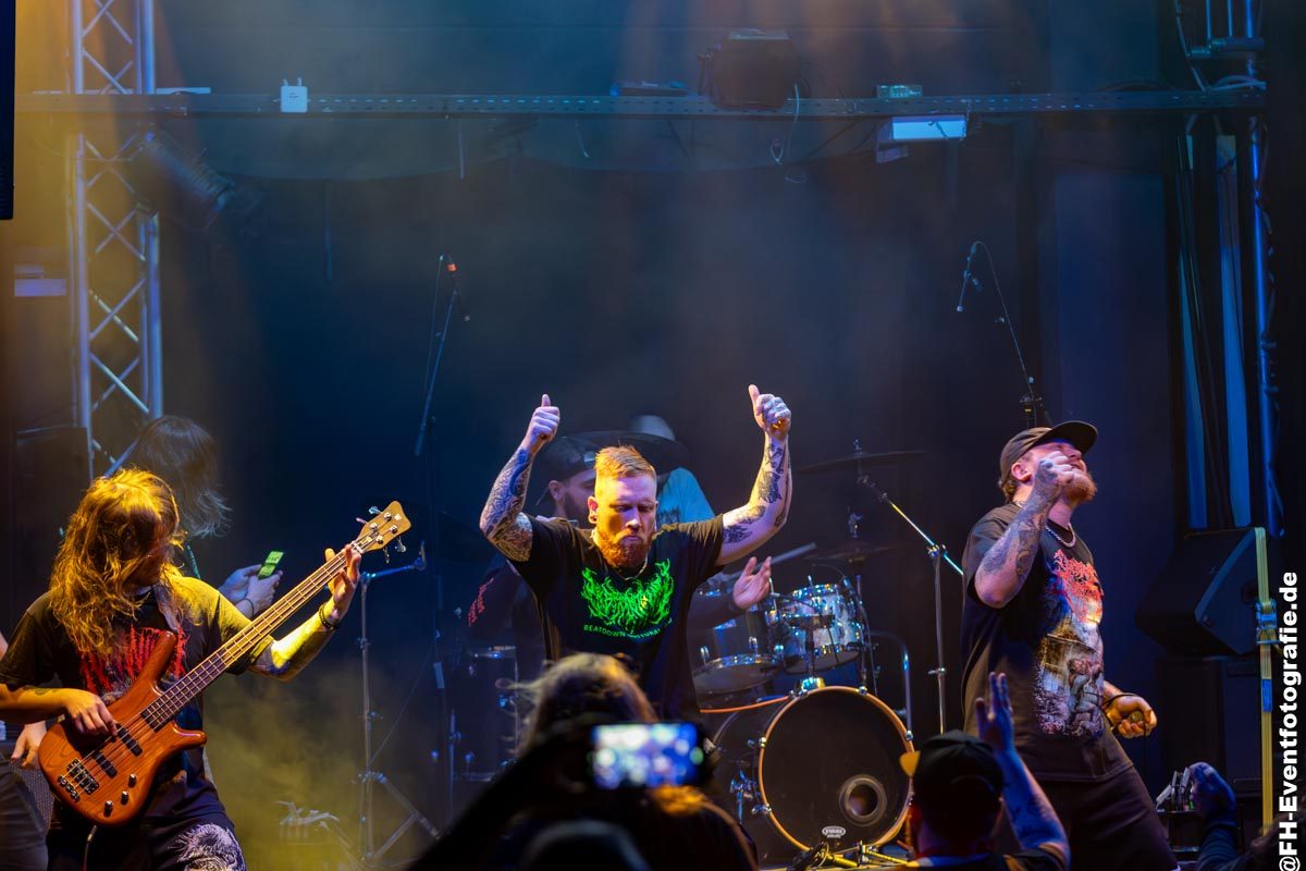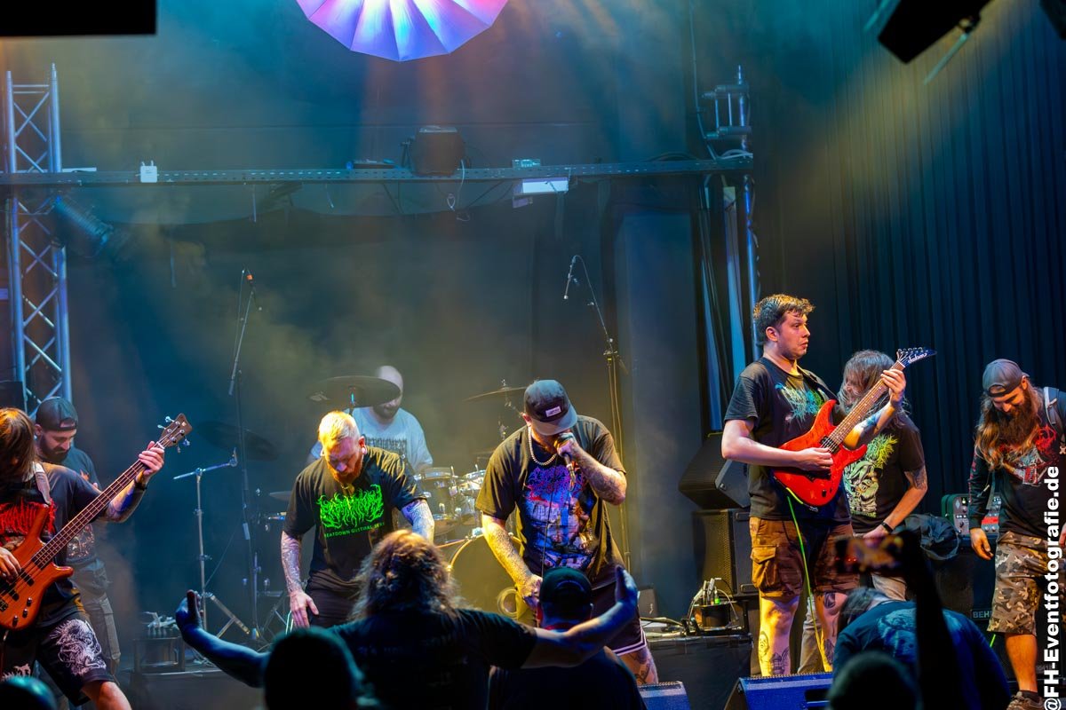 Epicardiectomy starten und räumen ab. Gerade in die Fresse, mit blankem Grind direkt in die Synapsen. Die tschechische Band ist besetzt wie ihre Vorgänger. Gitarre, Bass, Drums und Gesang. Es ist Grindcore, man muss den Gesang nicht mit Worten beschreiben, denn das ist schlicht kaum möglich. Die Tschechen demonstrierten mit nahezu perfekter Technik, wie das Gutturale einer Stimme als eigenes Instrument genutzt werden kann. Von Band zu Band eskaliert das anwesende Volk immer mehr.