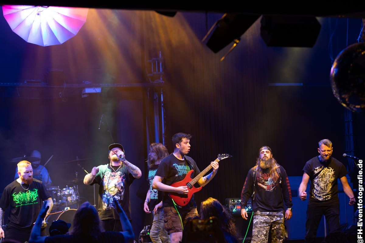 Somit geht es, mit durch den Abend geschliffene 10 Minuten Versatz zum Timetable, in den letzten Akt. Den Abend schließt Cerebral Incubation ab. Da hat doch glatt die Stadt der Sünde ihre Tore geöffnet und Gore und Grind sind ihren Weg über den großen Teich angetreten. Amerikaner in der kleinen Kufa-Halle Braunschweig.