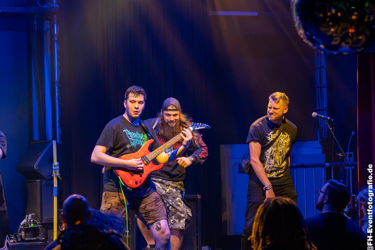 Als Zweites sind Traumatony an der Reihe. Russische Bürger mögen gerade teils einen schlechten Leumund haben. Bei Traumatony ist das wie bei vielen anderen unbegründet. Die komplett international besetzte Band ist enorm laute und musikalisch brutale Völkerverständigung. Vier Menschen auf der Bühne und Fans vor der Bühne. Laute, brutale Harmonie. Drums, Gitarre, Bass und Gesang, alles dabei und alles in der Genre-typischen Harmonie.